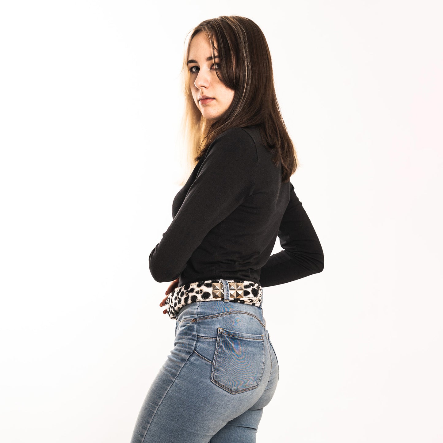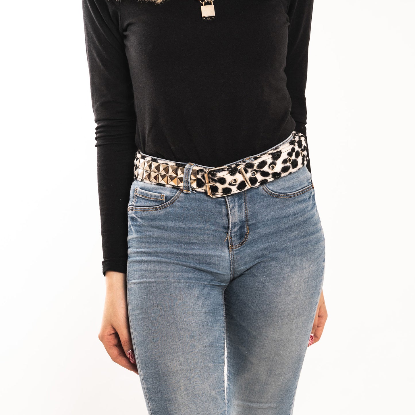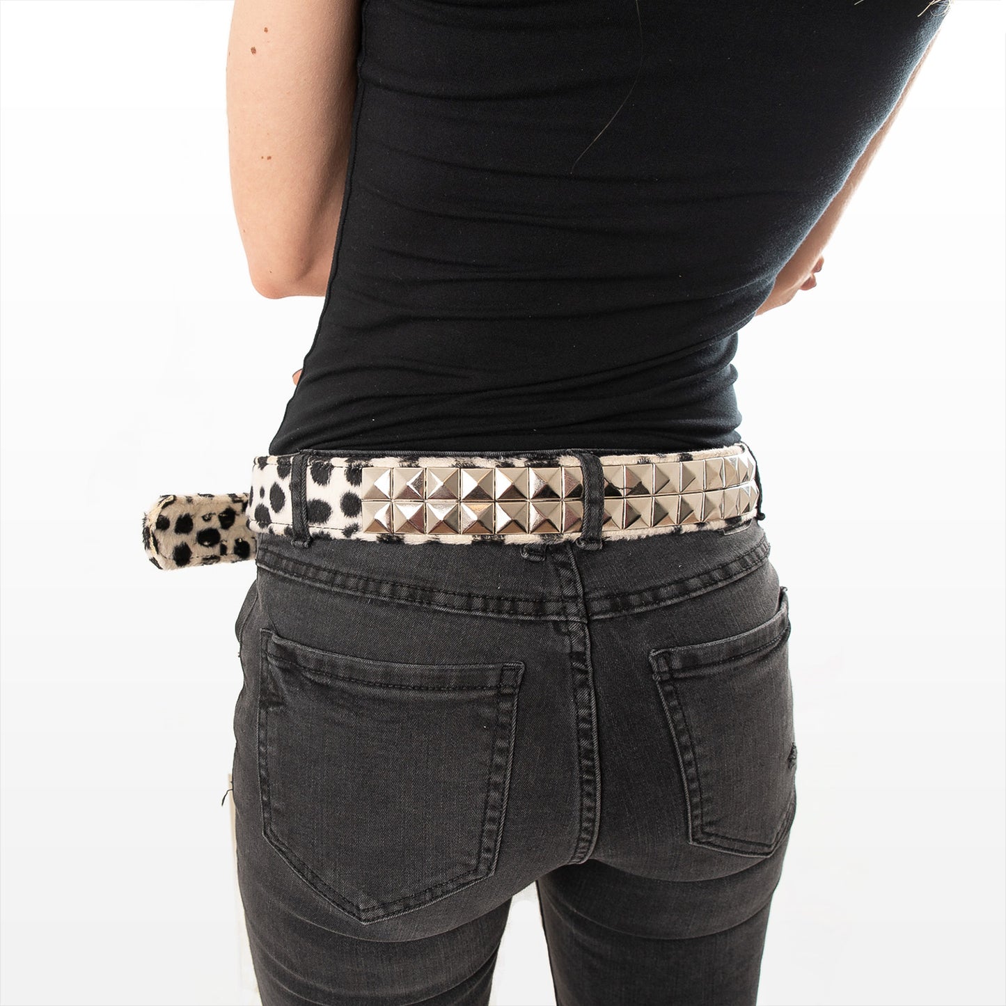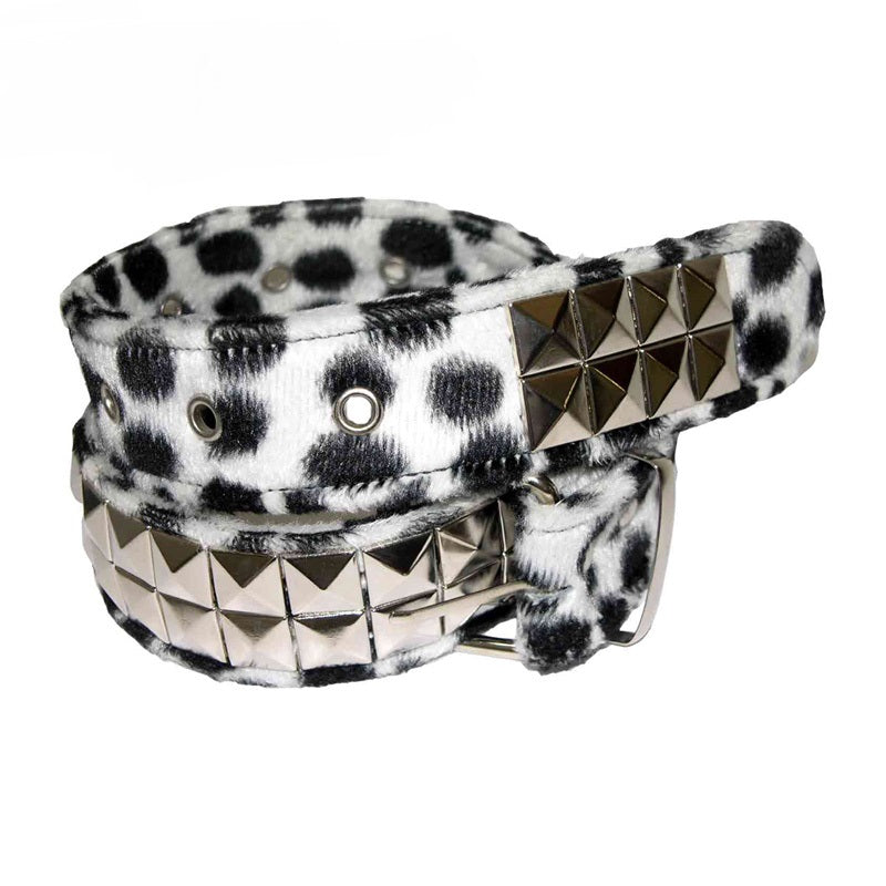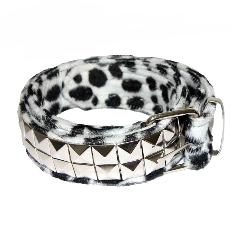 - Schwarz-weißer Gürtel 2-reihig Dalmatiner Pyramidennieten mit Kunstfell