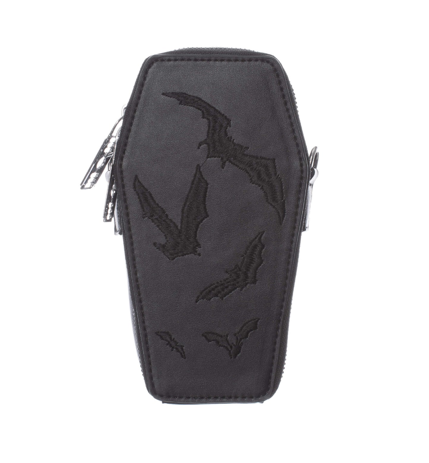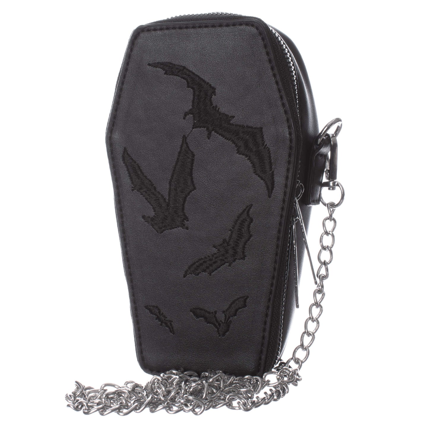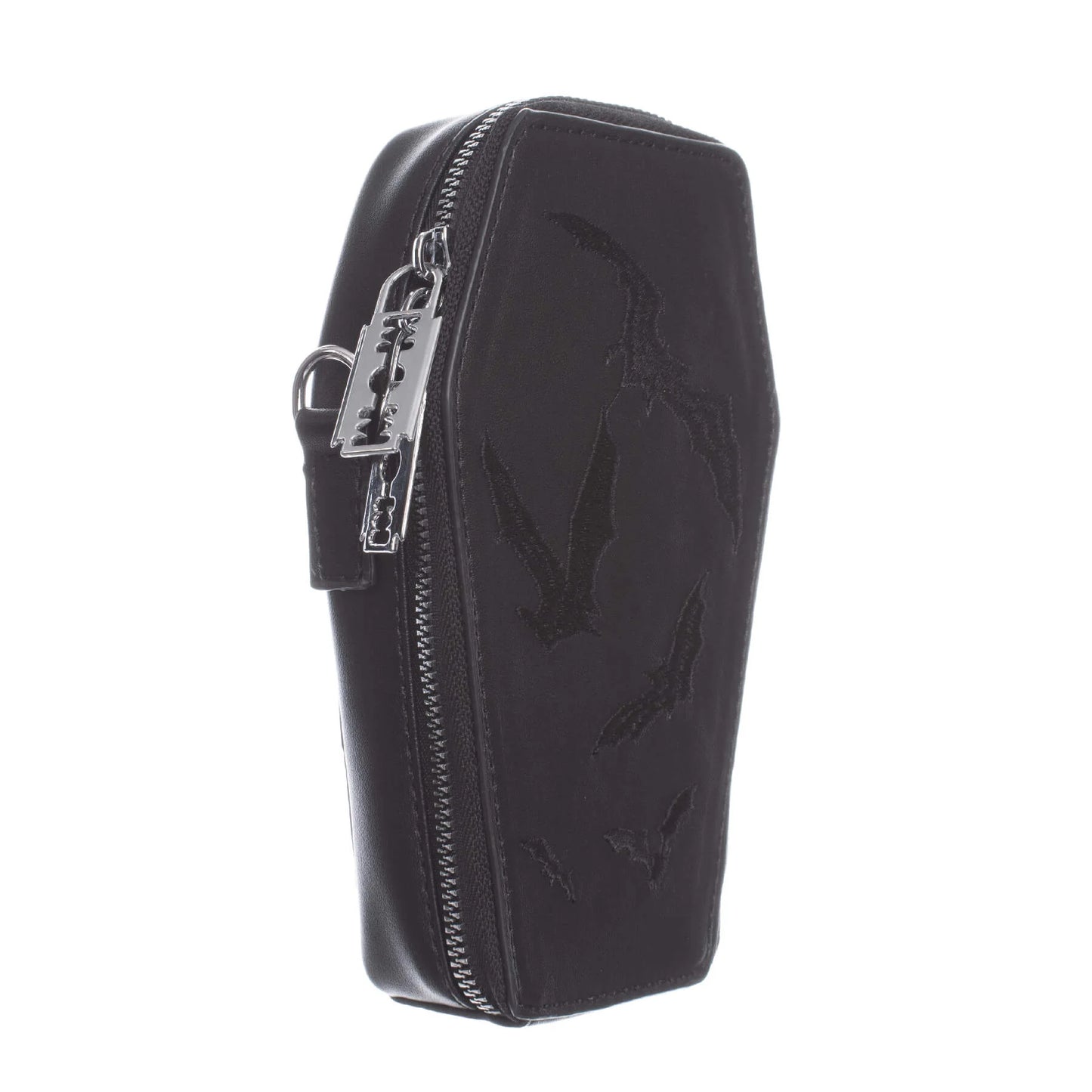 - Kleine, schwarze, sargförmige BAT MINI COFFIN BAG mit aufgestickten Fledermäusen mit Kette und Rasierklingenanhängern von Heartless