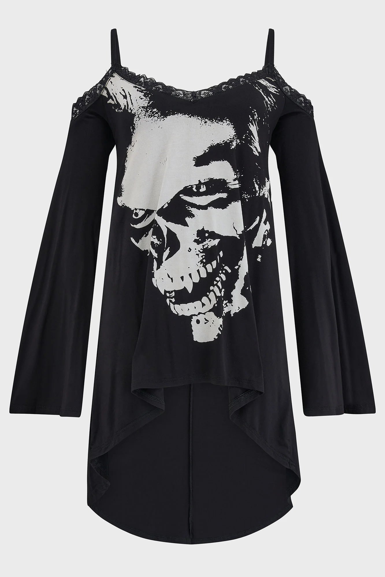 - Schwarzes Off-Shoulder-Oberteil YOU MUST FEED TUNIC TOP mit weißem Totenkopfprint und weiten Ärmeln von Killstar